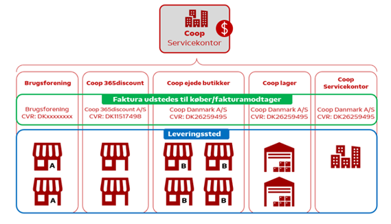 Hvis en ordre modtages fra en Coop-ejet butik, skal Coops CVR/GLN-nummer faktureres som juridisk enhed. Hvis en ordre modtages fra en brugsforeningsejet butik, skal den pågældende Brugsforenings CVR/GLN-nummer faktureres som juridisk enhed, og endelig hvis en ordre modtages fra 365discount, skal den pågældende 365discount butiks CVR/GLN-nummer faktureres som juridisk enhed. Der skal altid være den samme juridiske enhed på ordren og fakturaen.